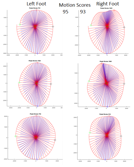 Initially I could maintain this pedaling style for only a few minutes, and would always lose correct angles if my mind wandered. I developed a weighted grading system and scored each of my rides. The metrics included: stability (pedal motion smoothness), circularity (constant circular velocity), foot angle accuracy, and special weighting on Right Horizontal foot angle, cadence and total foot angle range (my three problem areas). By spring the new pedaling style was feeling more natural, and I had no foot pain.