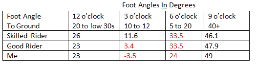 The numbers confirmed my observations. My foot angle range was too wide, two of my four rotational foot positions were off and my cadence was probably too slow.