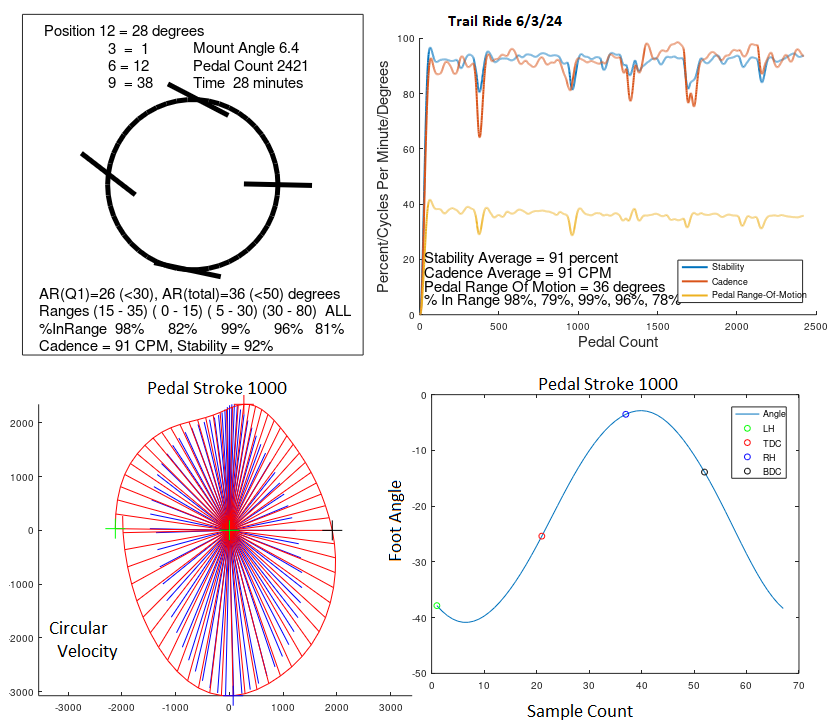 There are many other things to view. Another example is to overlay cadence with each (of the four) pedal angle waveforms to see the affects of pedal rotation speed. (I’ve read bike fitters describe knee/hip issues showing up in foot angles at various rotation speeds.)
