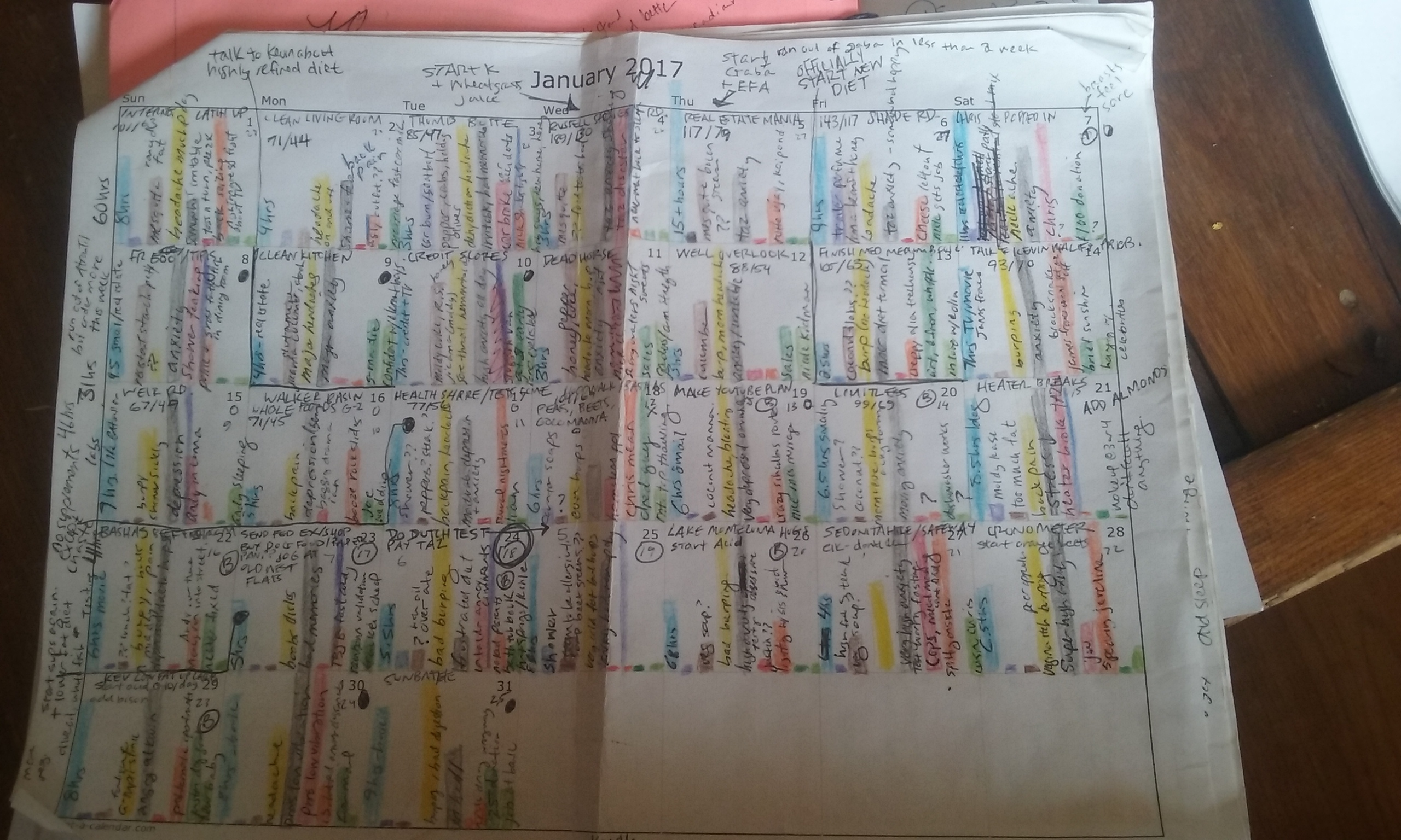 Sounds like a lot of stuff but it only takes 5 or 10 minutes to fill in. The calendar is my “at a glance” shorthand collator of the data from my two apps plus my journal. In my journal take notes throughout the day and I keep the more extensive observations, ruminations, to-do lists. I do write down foods in each meal on here as well as cronometer because I can’t flip through cronometer easily and see my meals on the same page as everything else that day, like…