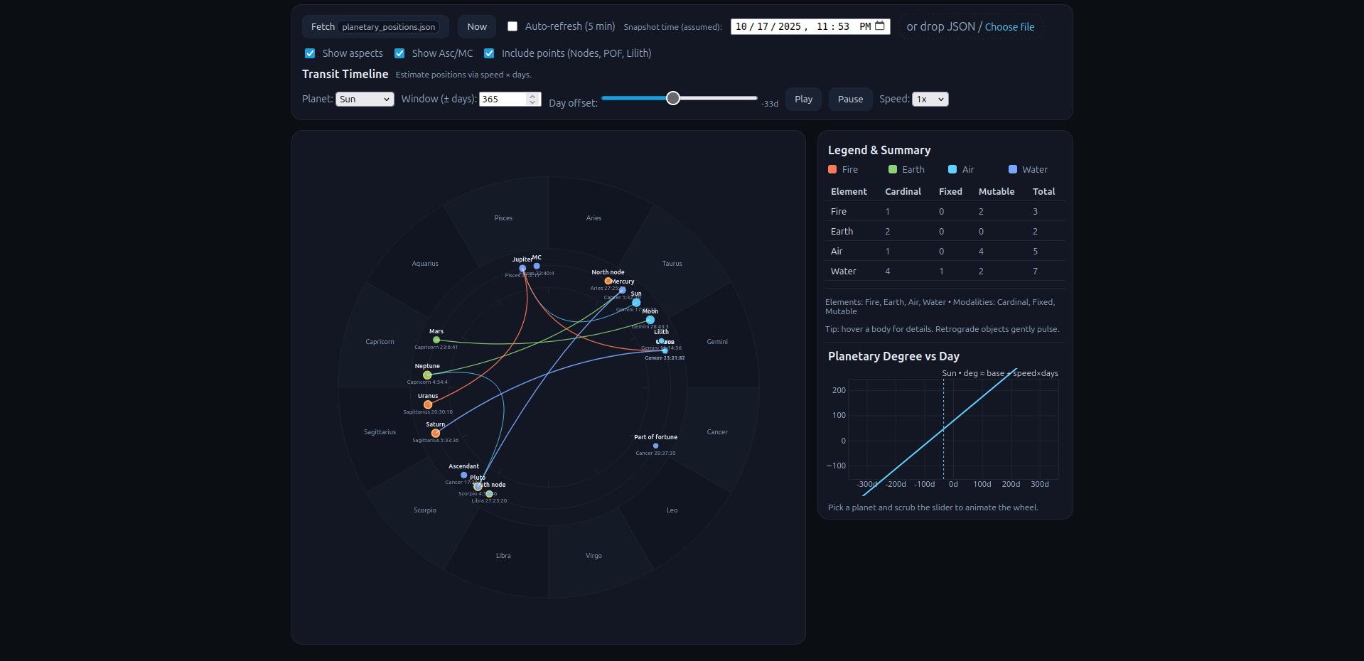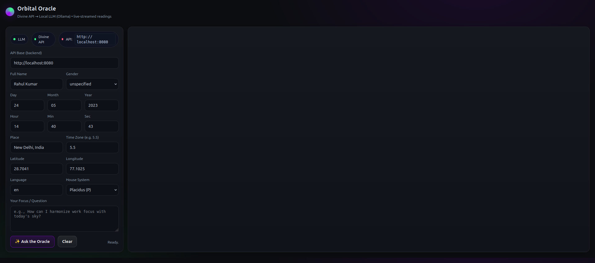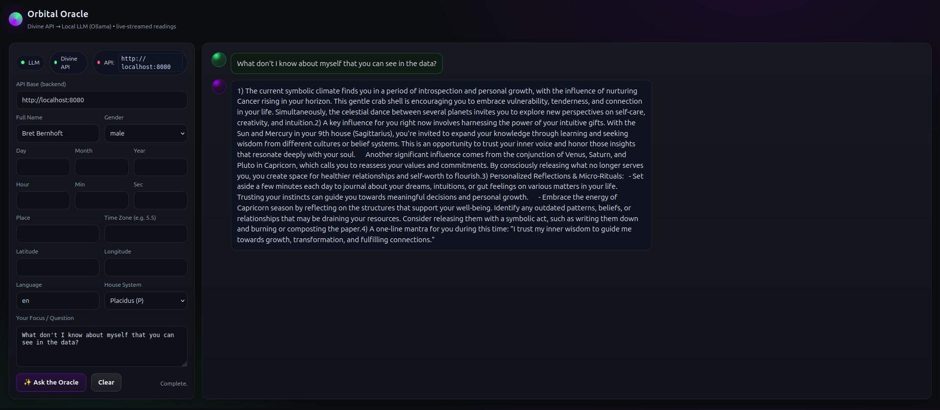 Hello everyone. Today I have something a little atypical to share. I recently built software which I am referring to as “Orbital Oracle”. Essentially, users submit info about their birth to Divine API and the response (containing personalized data from a western natal astrological paradigm) is fed to a locally deployed AI model in my home for summary/delivery.