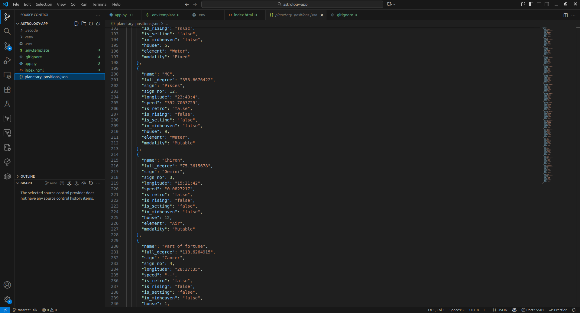 First I activate a Python script (a Flask server) on my main computer, acting as the connector between Divine API, the user and the LLM in my homelab. On the same computer, I next launch a frontend UI written in JavaScript, CSS and HTML, enabling a user to submit the place, date and time of their birth.