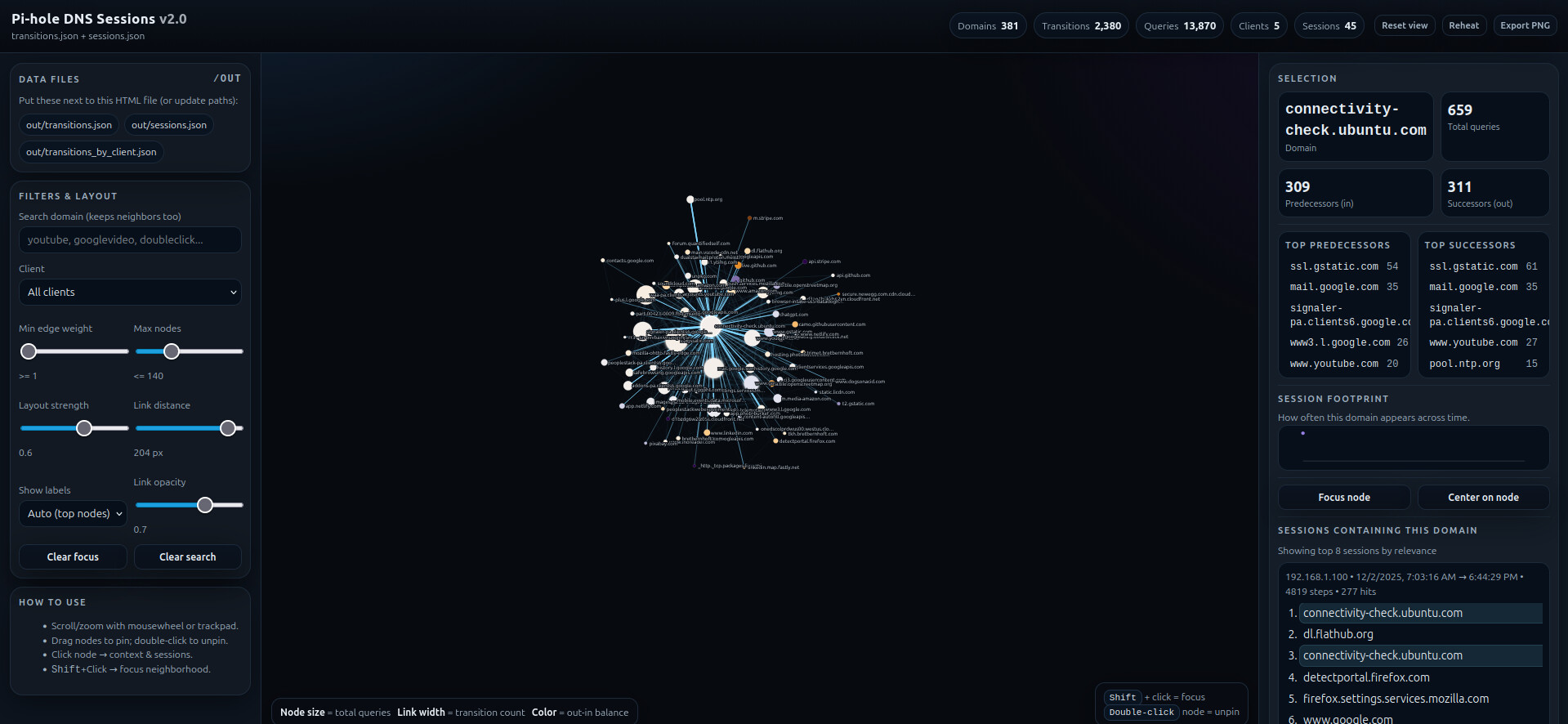 As part of learning more about myself through data, I thought it would be interesting to visualize Pi-hole DNS queries made during a given computer session as a network graph. So I developed a Python/JavaScript application (or workflow) to accomplish this.